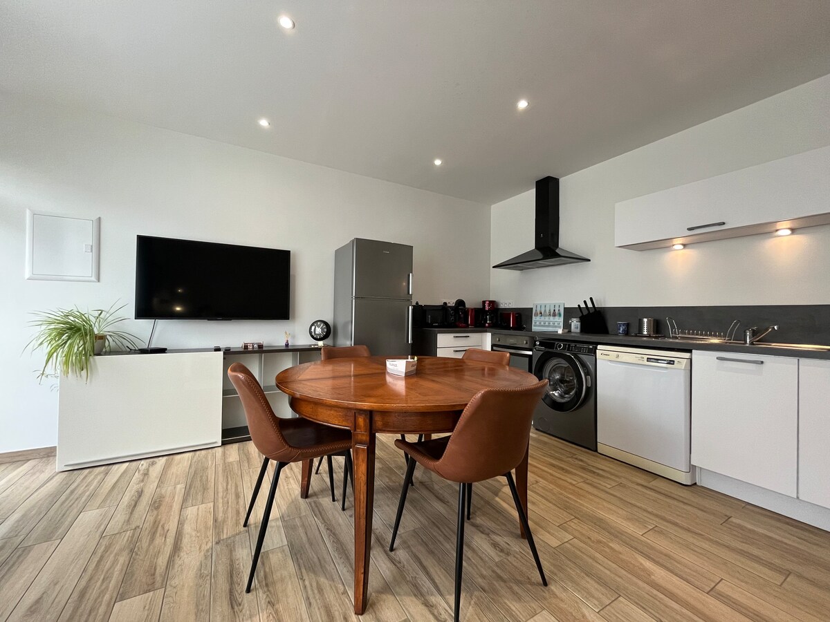 この平和で中心部に位置する宿泊施設で、生活をシンプルにしましょう。 アパートは全面改装済み、明るく、設備が整っています。デジコードで保護された建物の1階にあります。 レストランやショップから50メートル 港から100メートル ラ・バンシュ・ビーチから200メートル。 この宿泊施設には、設備の整ったキッチン、オレンジのデコーダーとChromecastを備えたテレビがあります。リネンとタオルが提供されます。クイーンサイズのベッド(160 x 200)が1つある寝室と、リビングルームにはソファーベッドが1つあります。