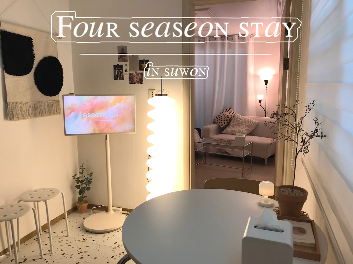 # 連泊割引 # 毎日のリネン交換 # 感性的な宿泊先 # 居心地の良さ # インテリア # 虫のいない1階の宿泊先 ♡⃞⃛୭ フォーシーズンステイは静かな住宅街の間に位置する建物で、最近オリモデリングを通じて4季節を通して清潔で快適な空間でお迎えします。♡⃞⃛୭