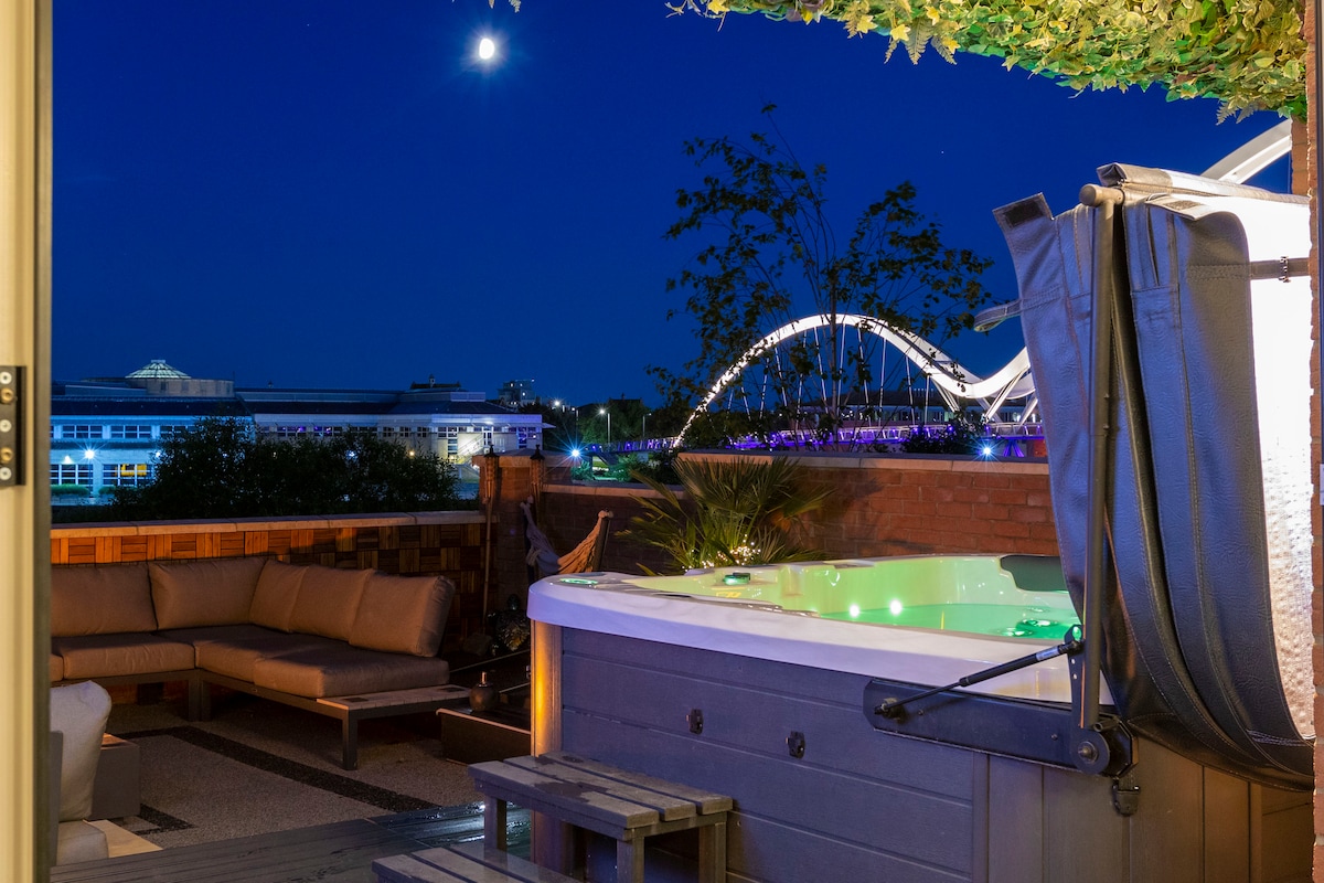 Modern 4 bed 3 storey townhouse situated on the banks of the River Tees with stunning views of the Infinity Bridge all the way to Roseberry Topping & beyond... Relax in a hydrotherapy hot tub or recessed seating area with firepit & outdoor tv whilst enjoying home made pizza fresh from the pizza oven. This state of the art smart home is finished to the highest standard with 1.2GB ultra fast broadband with full sky package (movies, sports, amazon prime & Netflix) included EV charging (Type 2)
