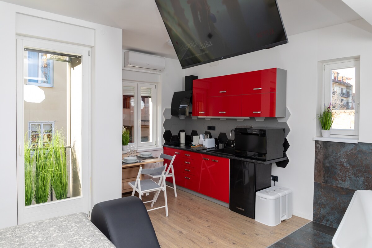 Apartment for relaxing and enjoying in the city center, Tkalčićeva ulica, in pedestrian area close to many different restaurants, cafes, souvenir shops and all major Zagreb landmarks. Open space concept without doors. Including central position bathtub for two and big walk in shower. Queen size bed and yoga chair for relaxing. Fully equipped kitchen. It's on the the fourth floor in building without elevator. For your discretion entrance is with the digital lock at any time.