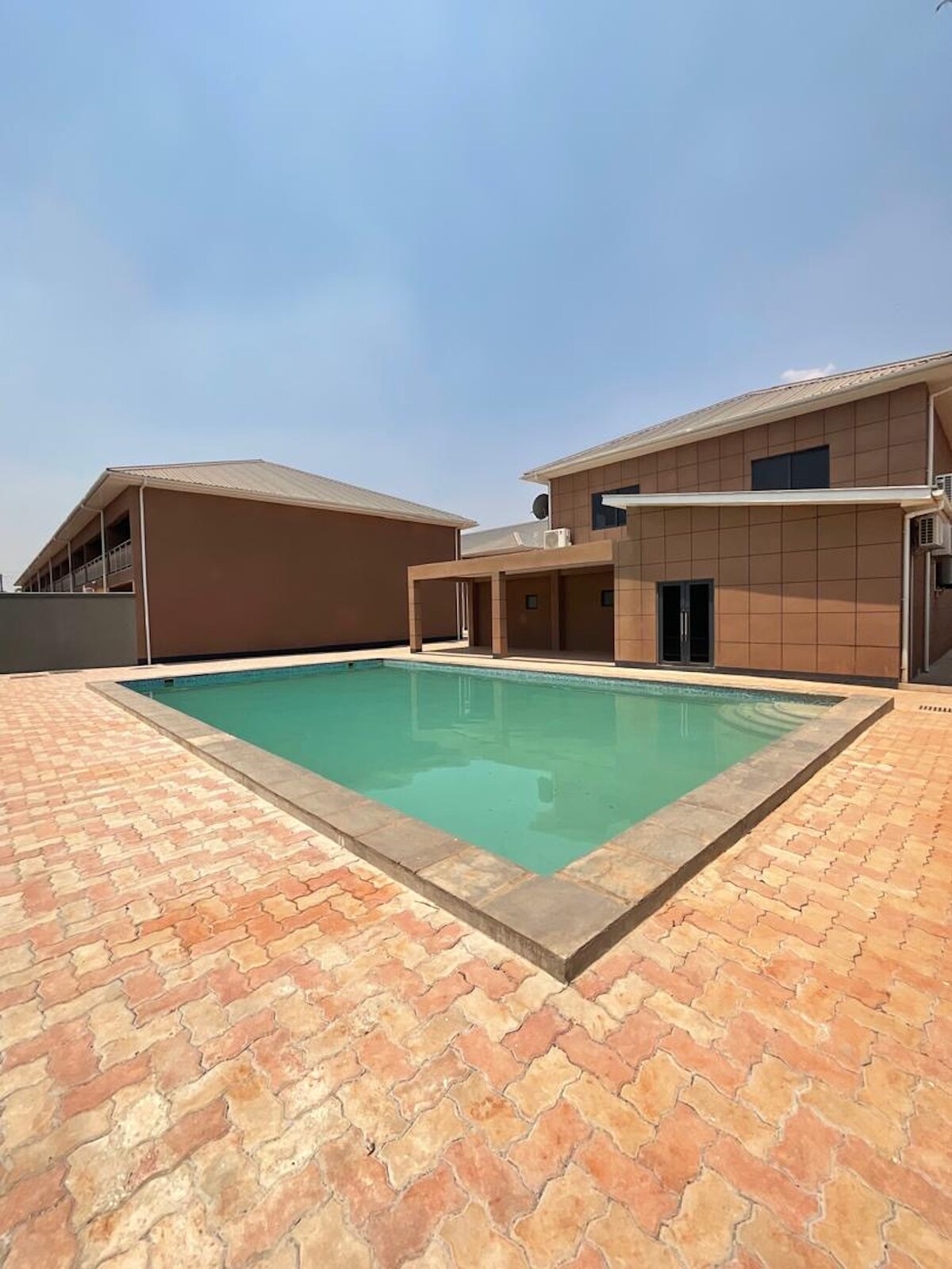 豪華なオープンプランの宿泊先、ダブルベッド4室、シングルベッド3台のロフト、3つのバスルーム、Wi - Fiプール付きバー-スノーカールームバルコニー、パティオ-洪水に照らされたテニスコート-パビリオン-素敵な先住民族庭園-ショッピングセンターとアメニティ・設備に近い。 この宿泊施設は追加料金なしで完全に整備されています-壁とゲート(電気)が完備されており、安全に保管されています。とても穏やかで美しいエリアにあります ZESA停電の場合の代替電源があり、宿泊施設のすべての水は自社のボアホールからのものです