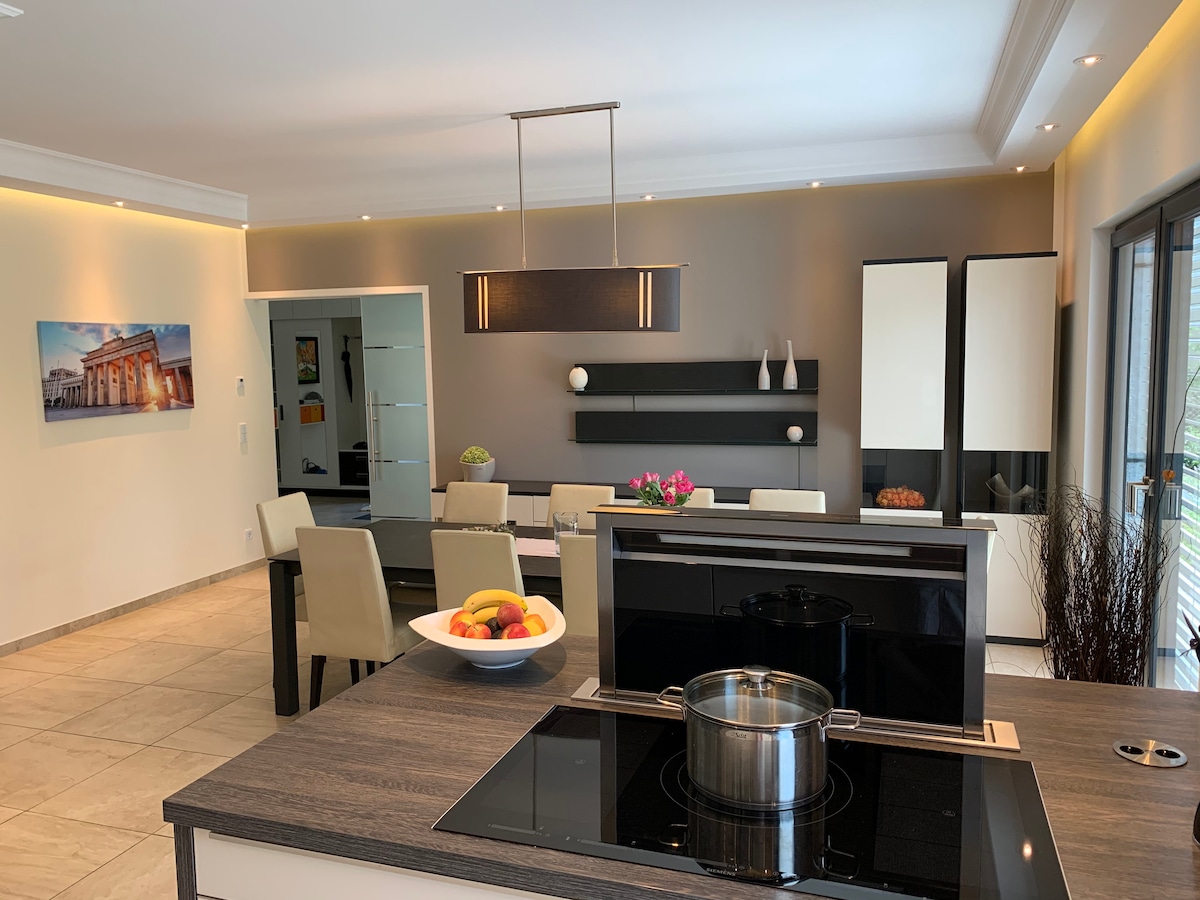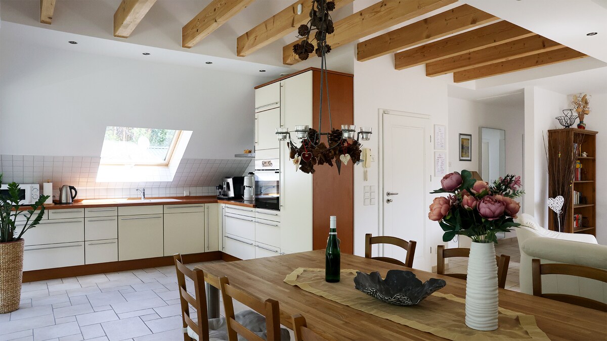 屋根裏のアパートは、ポツダムとベルリンから車で20分、BERから電車で30分の距離にあります。広々とした設備の整ったデザインキッチン*、アガペ・ビエケスバスタブと洗面台*、2.70mのベッド*、フィットネスルームは2つ目の寝室として使用できます。ここには、1.80mのダブルベッド* NETFLIX、Disney +、Amazon Primeログイン用のアプリがプリインストールされたビーマー、おもちゃ、パン屋と肉屋のあるスーパーマーケット、ドリンクマーケット*湖での水泳とハイキングがあります