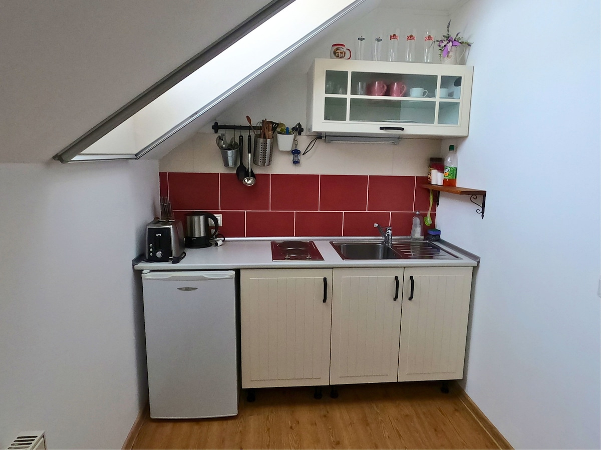 このアパートは、アパートの1階のゼチェンテロヴァ通りにある歴史的な鉱業の町クレムニツァの中心部にあります。アパートは、キッチン、バスルーム、ソファベッドを備えたリビングルーム、小さなベッドルームに繋がっている廊下で構成されています。 キッチンとバスルームにつながっている廊下には、より快適な床暖房があり ます。宿泊施設には、冷蔵庫、洗濯機、コーヒーメーカー、Wi - Fi接続、設備の整ったキッチンとバスルームを備えた完全に家具付きのアパートがあります。